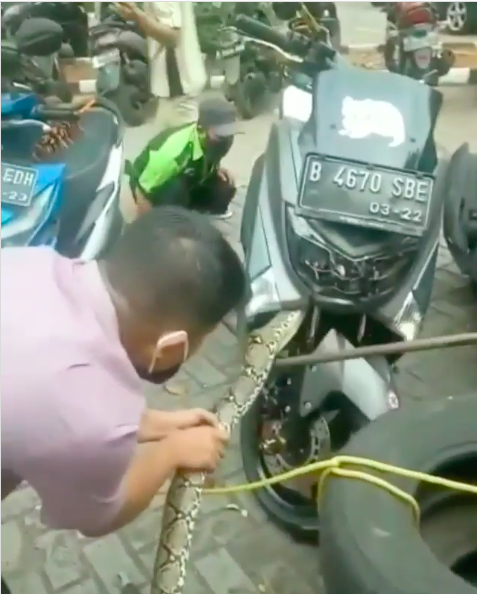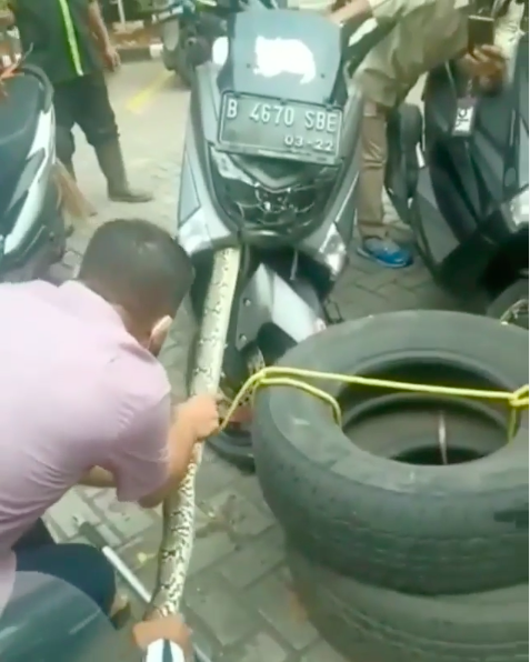 Insiden itu berlaku di Tanjung Priok, Jakarta Utara dan sedang tular dalam kalangan warga maya di sana kerana tiga tenaga lelaki dewasa pun masih belum mampu mengeluarkan ular tersebut.