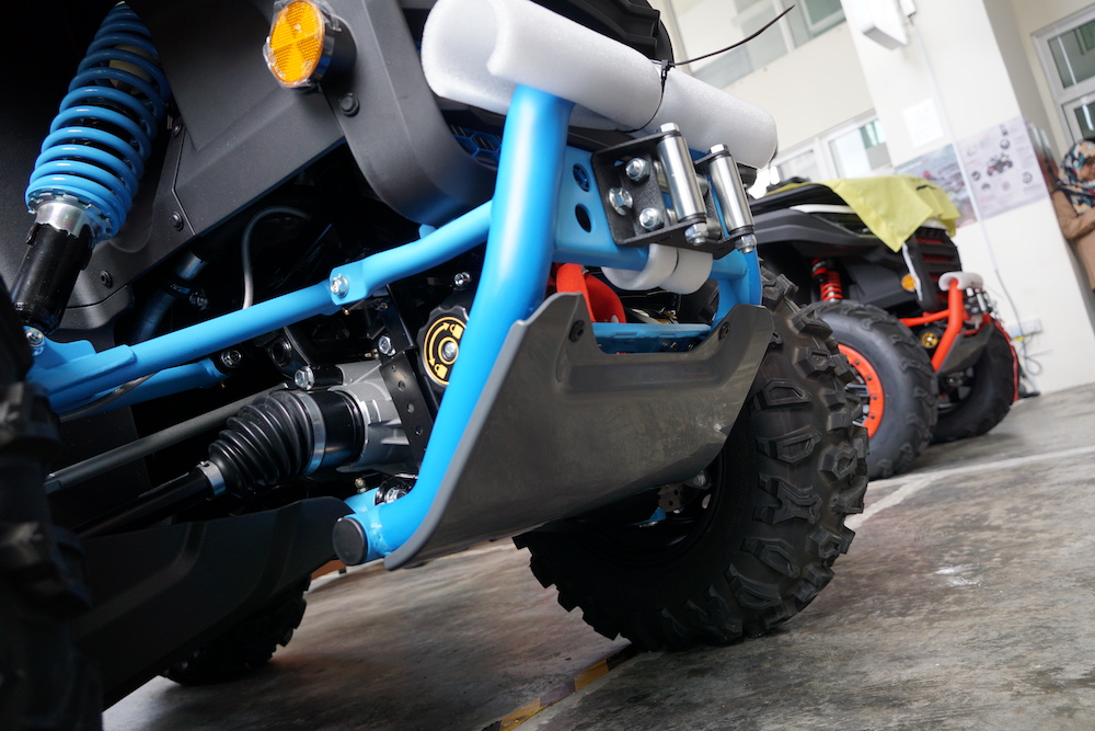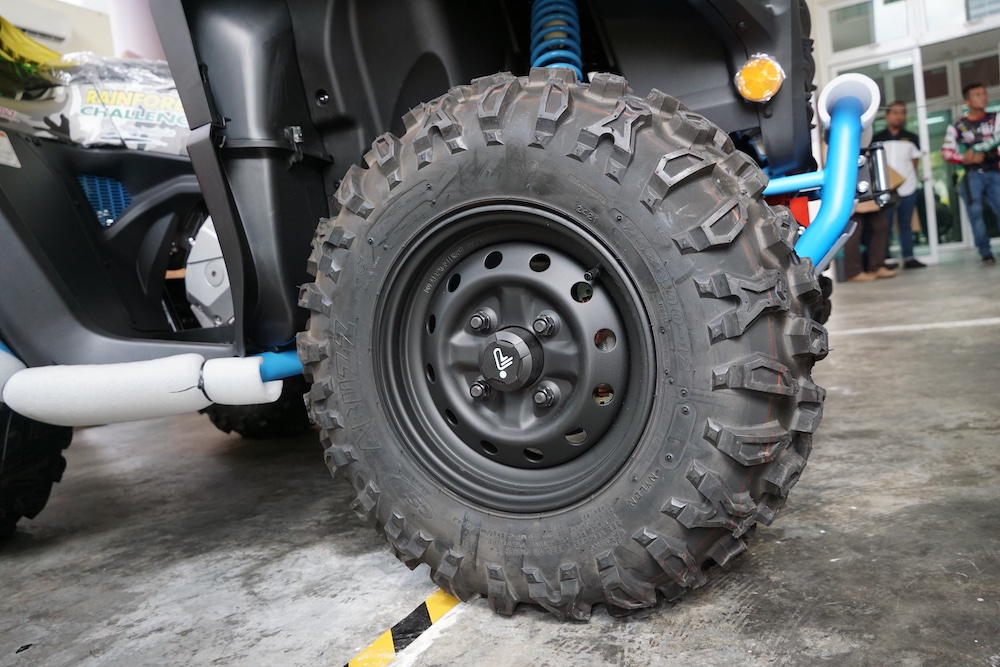 - Dipasangkan rim keluli 12 inci dengan sistem brek cakera hidraulik (tiga cakera).