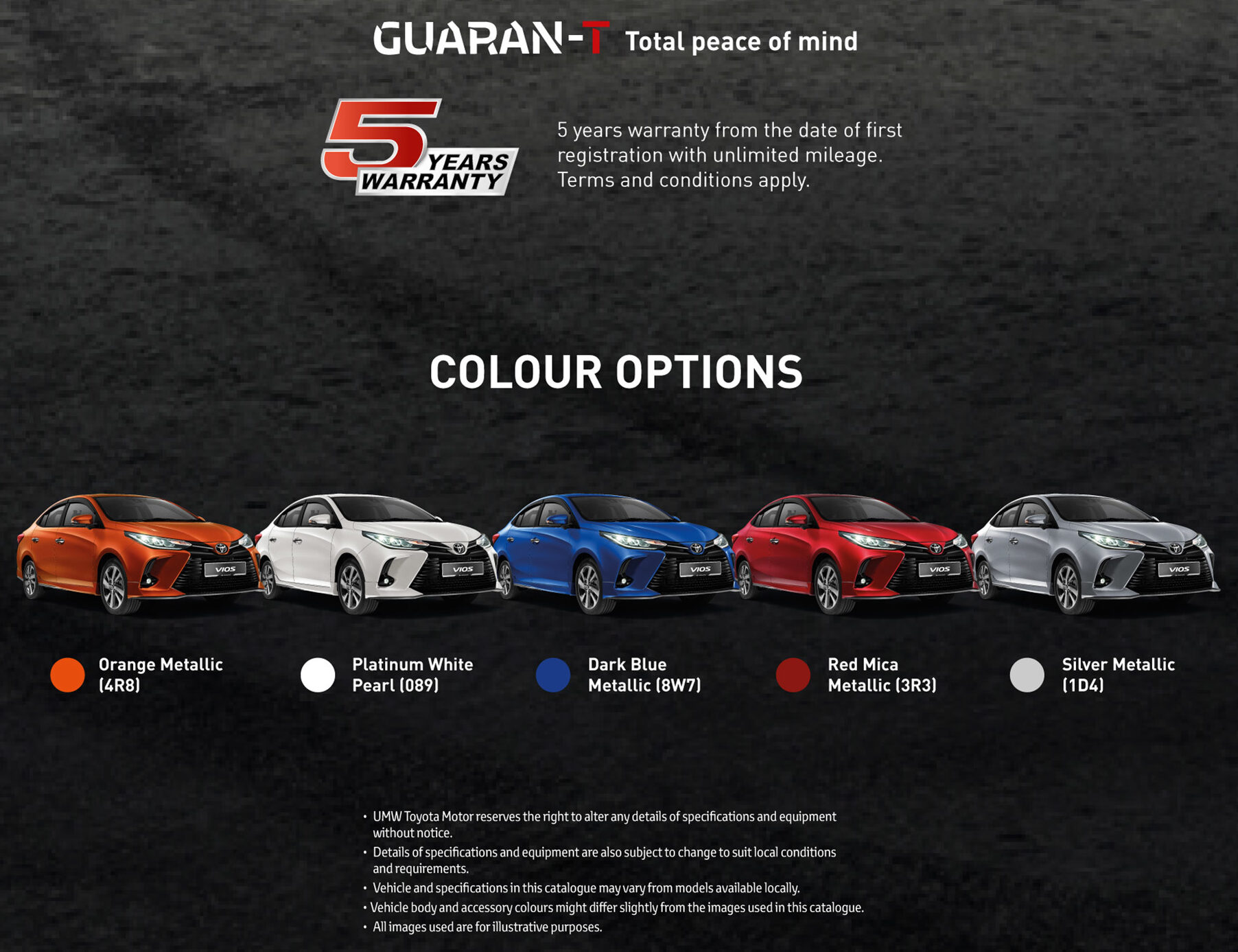 Setiap pembelian dipakejkan dengan waranti 5 tahun, dan ada lima warna untuk dipilih, iaitu Orange Metallic (jingga, warna baharu), Platinum White Pearl (putih), Dark Blue Metallic (biru), Red Mica Metallic (merah) dan Silver Metallic (perak). Warna hitam digugurkan dalam senarai.