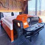 Salah satu bilik menawarkan katil diperbuat dari model BMW E36 dipotong. Penggemar off-road pula boleh memilik bilik bertema Jeep Wrangler.