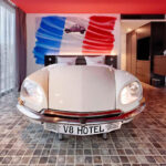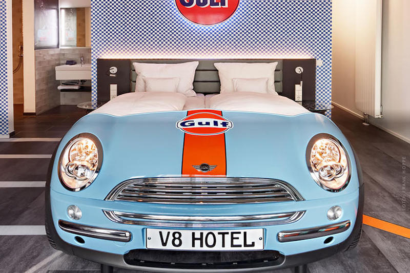 Dipanggil V8 Hotel, premis yang terletak di bandar Stuttgart itu menyediakan 26 bilik istimewa bertema kenderaan dengan perabot diperbuat menggunakan komponen sebenar kereta. Ini termasuk katil untuk penginap tidur.