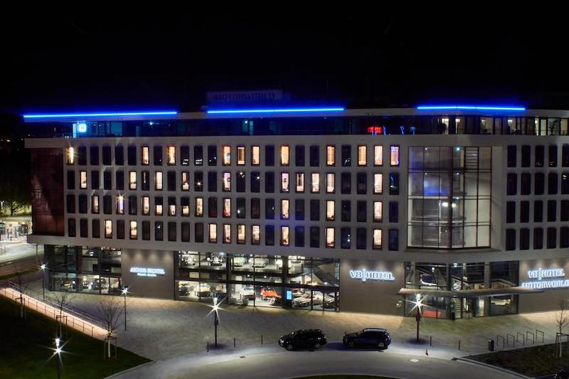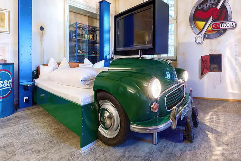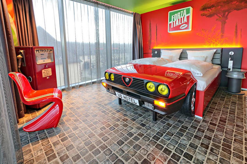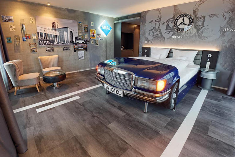 Dipanggil V8 Hotel, premis yang terletak di bandar Stuttgart itu menyediakan 26 bilik istimewa bertema kenderaan dengan perabot diperbuat menggunakan komponen sebenar kereta. Ini termasuk katil untuk penginap tidur.