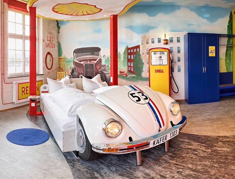 Salah satu bilik menawarkan katil diperbuat dari model BMW E36 dipotong. Penggemar off-road pula boleh memilik bilik bertema Jeep Wrangler.