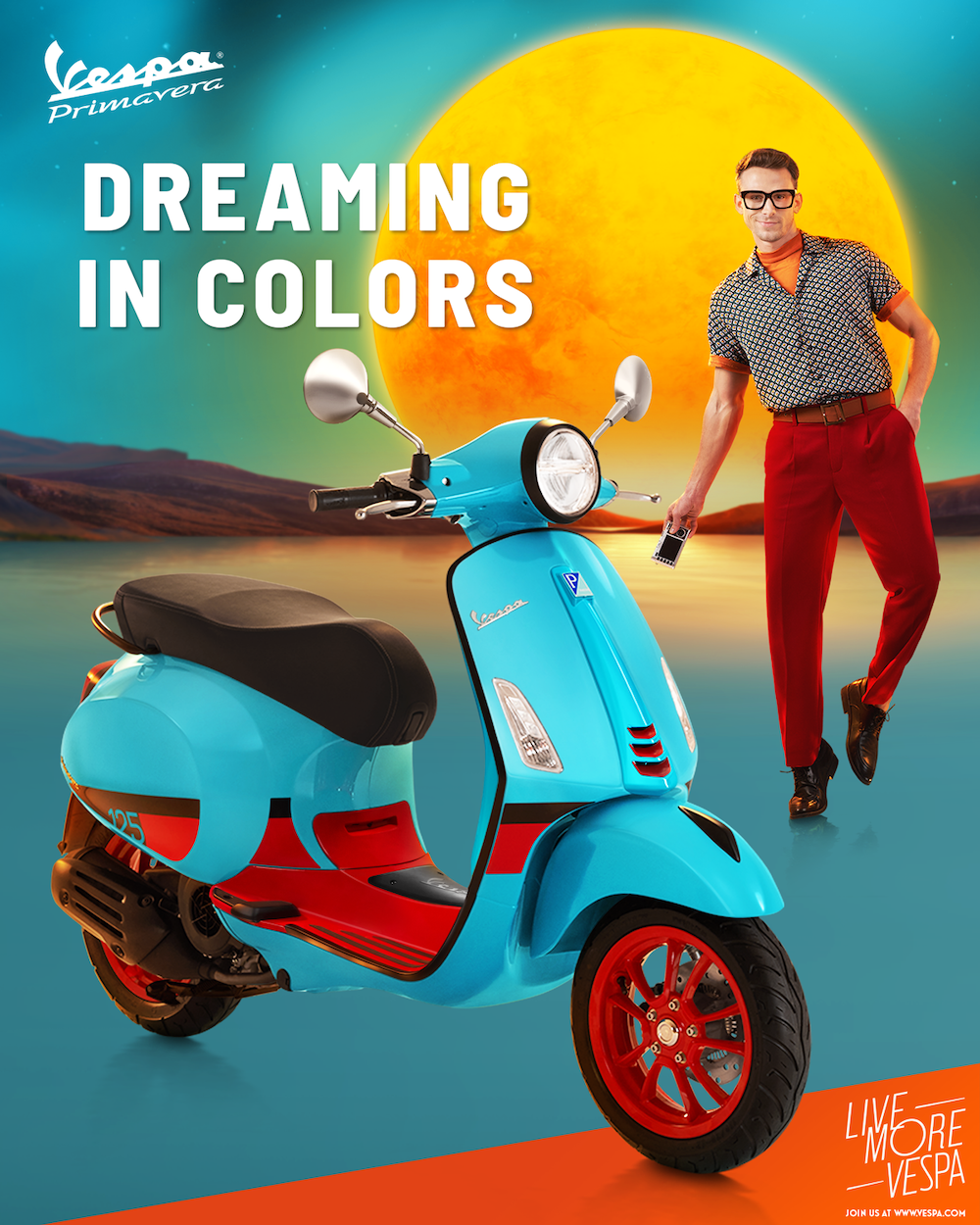 Vespa segmen 150cc itu ditawarkan dengan slema warna Orange Tramonto (jingga) dan Blue Audace (biru).