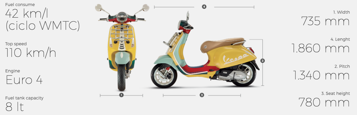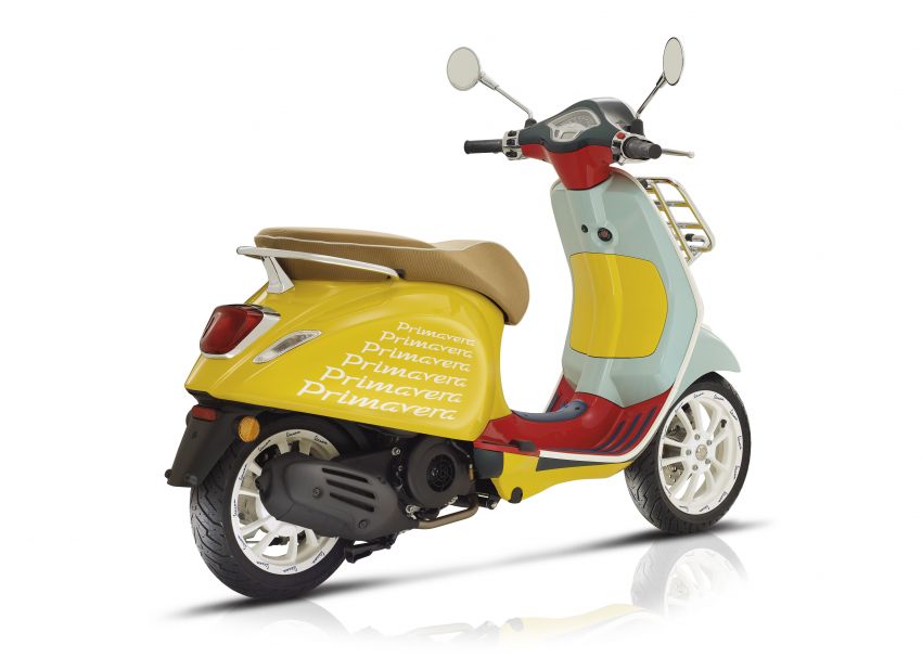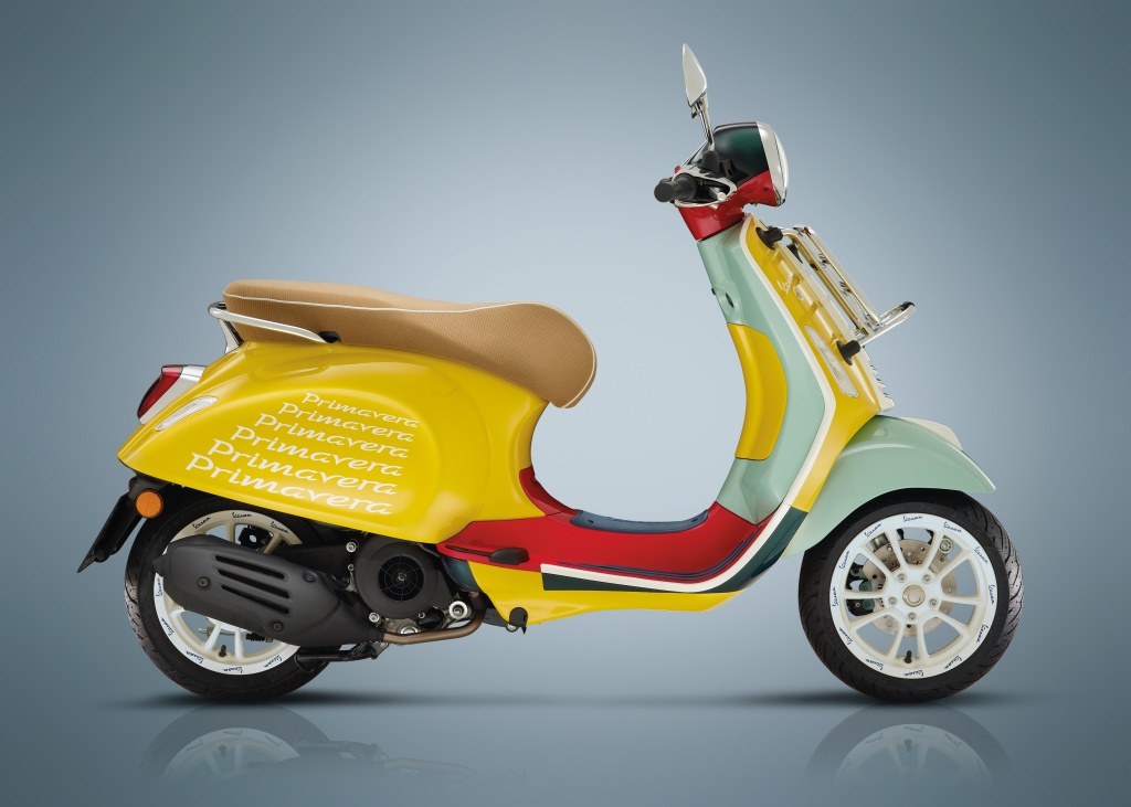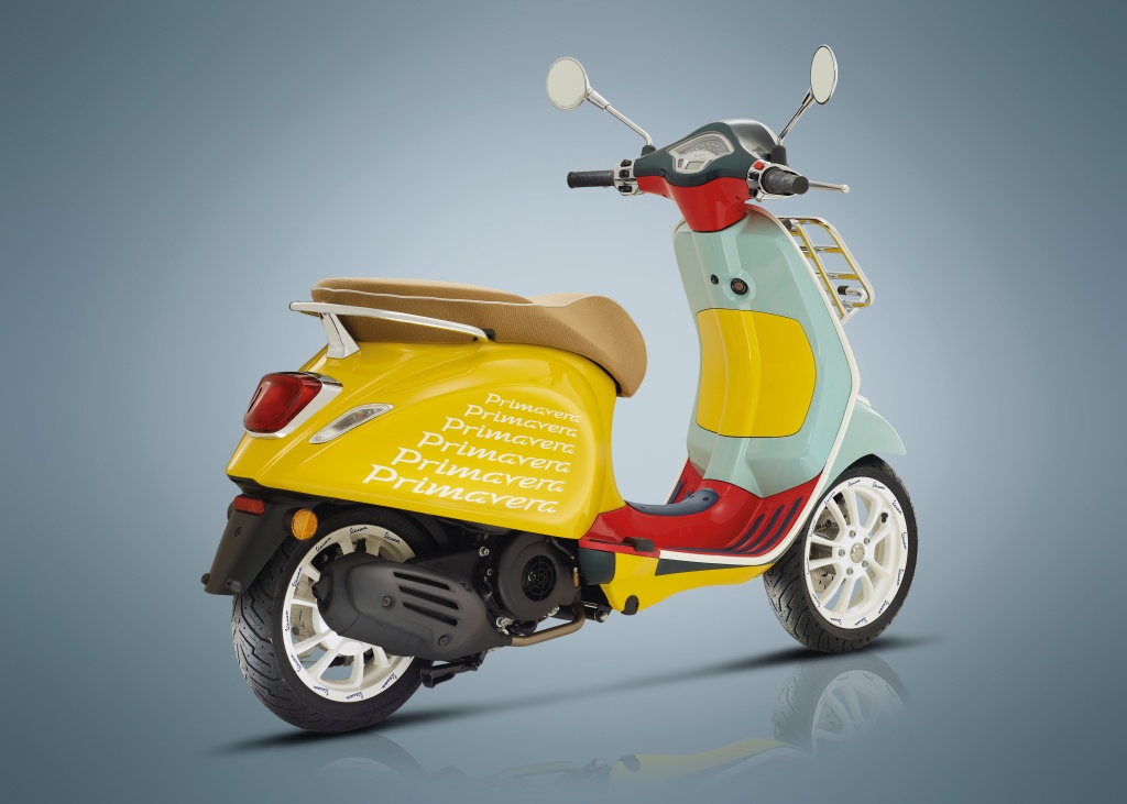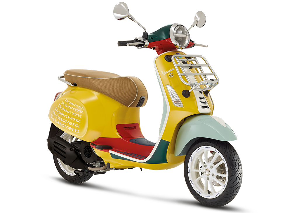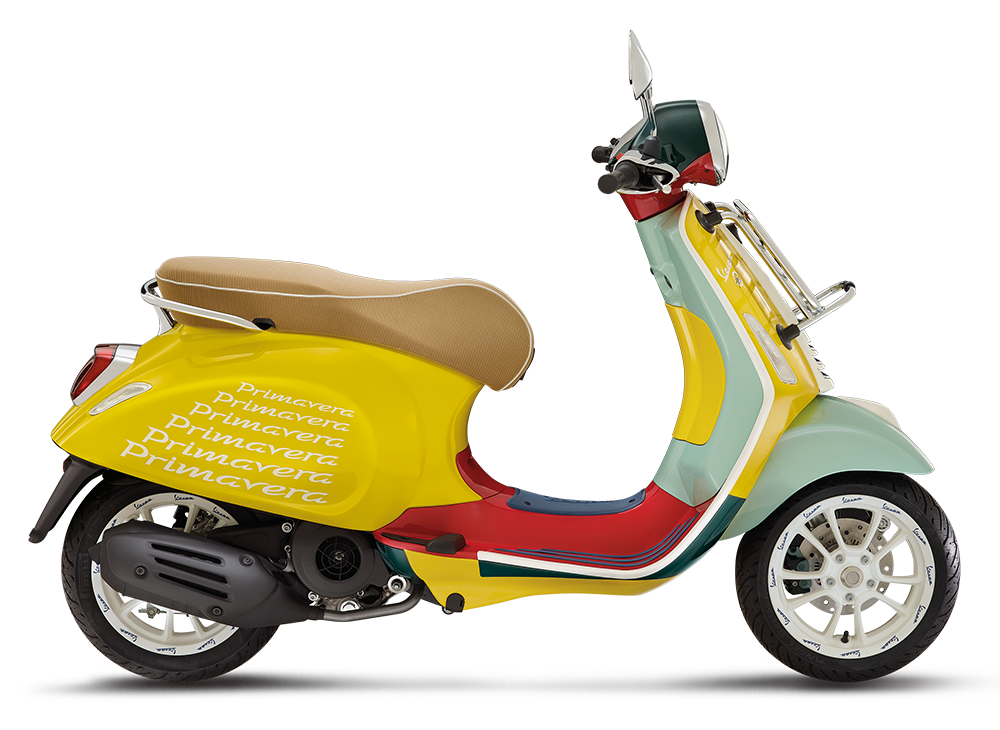 Logo signatur Vespa berwarna putih dan gafik khas pengulangan perkataan ‘Primavera’ dilukiskan di kedua-dua sisi badan untuk kesan unik yang memiliki gaya tersendiri. Ya, tidak ada Vespa lain yang sama seperti model khas ini.