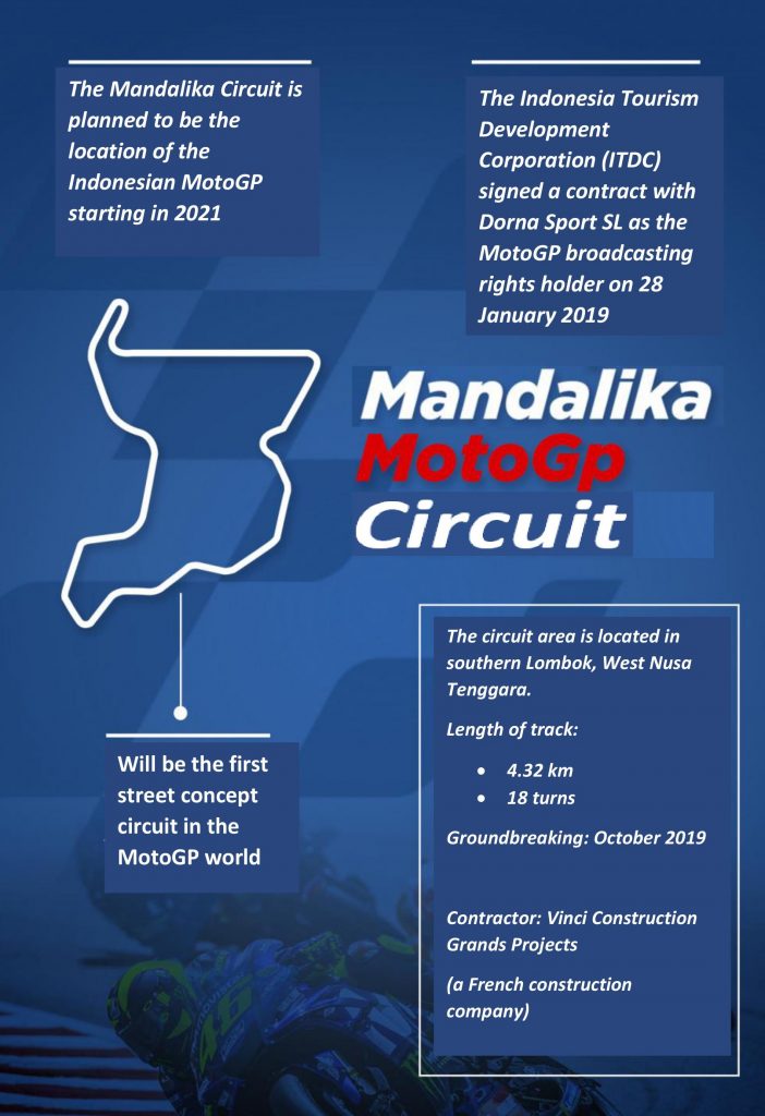 Litar Mandalika adalah satu daripada dua litar baharu MotoGP yang dijangka disenaraikan dalam kalendar MotoGP 2021, bersama dengan Brazil. MotoGP Indonesia kali pertama diumumkan akan kembali pada Februari tahun lalu dan kini sedang dalam pembinaan yang mana upacara pecah tanah sudah dibuat Ogos lalu.