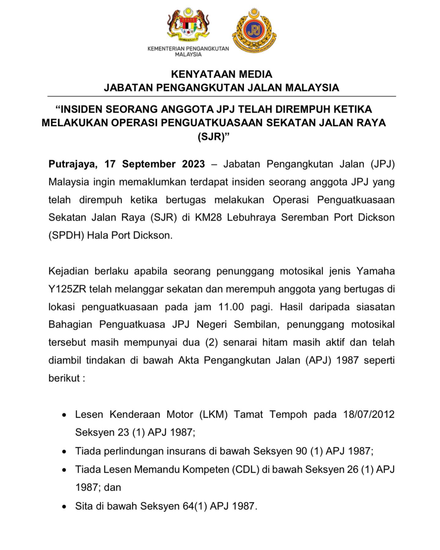 JABATAN Pengangkutan Jalan (JPJ) dalam kenyataan di laman Facebook rasmi semalam mendedahkan insiden seorang anggotanya dirempuh seorang penunggang Yamaha 125ZR ketika bertugas melakukan sekatan jalan raya (SJR) di KM28 Lebuhraya Seremban Port Dickson seperti ditularkan dalam video di media sosial.