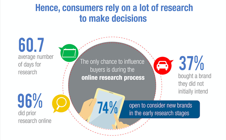 Hasil kajian mendapati 34 peratus responden mengatakan mereka mula memikirkan proses membeli tanpa sebarang maklumat mengenai produk yang diinginkan, manakala 96 peratus melakukan kajian awal atas talian (online) sepanjang tempoh dua bulan (secara purata) sebelum membuat keputusan.
