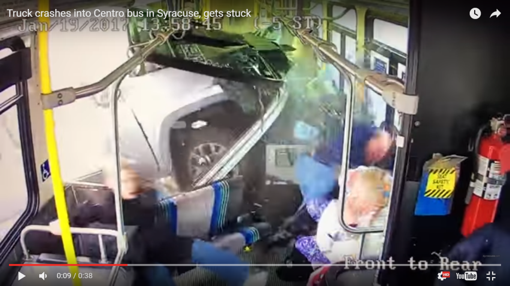 Tidak lama kemudian, Penumpang 1 (wanita) yang duduk bertentangan sisi bas yang dirempuh mula perasan ada sebuah trak sedang meluru ke arah bas, lalu dia menjerit. Serentak itu juga Penumpang 2 (lelaki) yang duduk di hadapannya menoleh ke belakang, melihat trak dan cuba meloncat daripada kerusi (lihat detik 0:08 saat di bawah). Pada masa sama trak itu turut merempuh tepi bas hingga membuatkan Penumpang 2 terperosok ke kerusi di depannya.