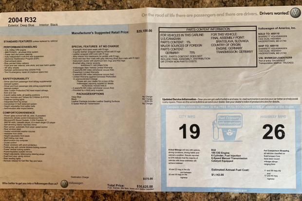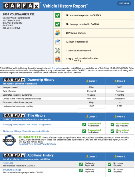 Kereta tersebut dihantar dalam unit baharu ke Sharrett Volkswagen of Hagerstown di Maryland, AS sebelum dibeli penjual pada Februari 2020 daripada pemilik asal. Ia kemudian dijual siap dengan filem cermin tingkap, dokumen pembelian asal, manual pengeluar, repot Carfax (syarikat penilai kereta terpakai) dan pengesahan Connecticut atas nama penjual.