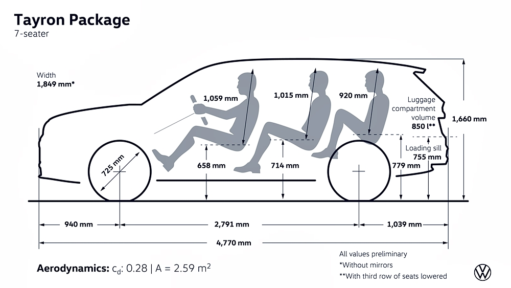- 4,792 (p) x 1,660 (l) x 1,852 (t) mm – SUV VW kedua terbesar di Eropah.