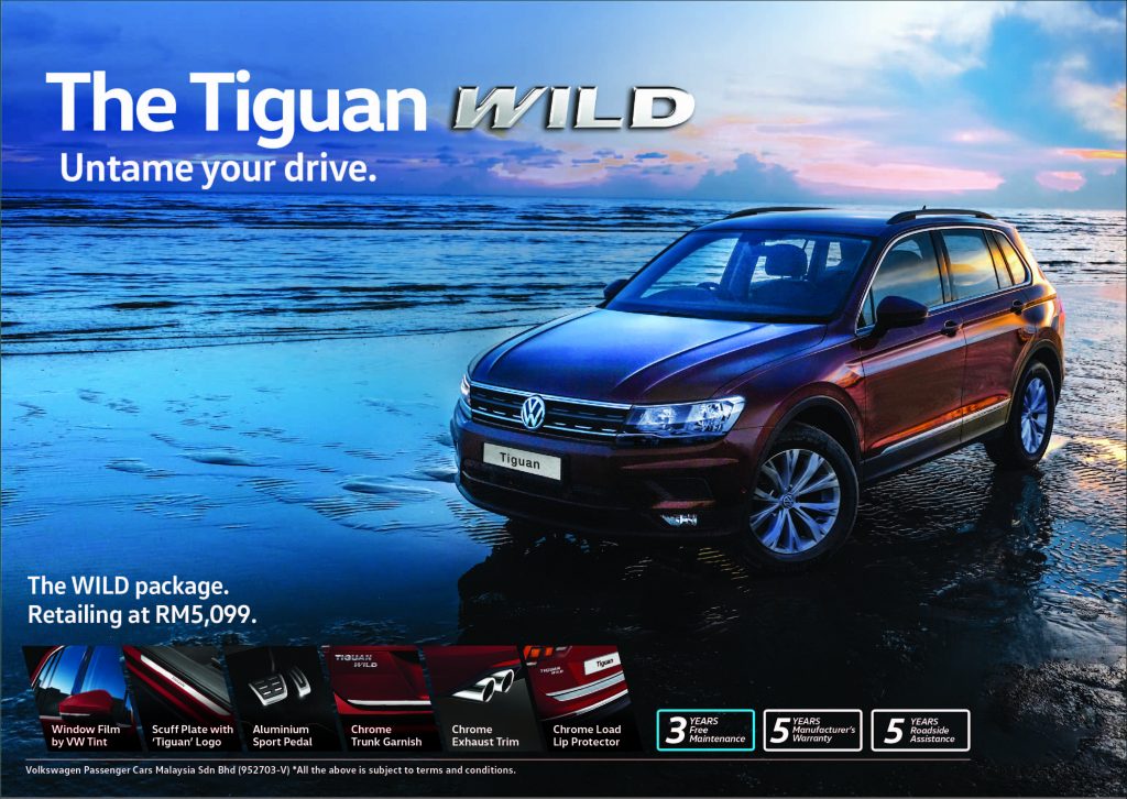 VOLKSWAGEN Tiguan tampil dengan pakej baharu ‘Wild’ yang menawarkan beberapa perubahan kosmetik pada harga tambahan RM5,099, terdiri daripada: