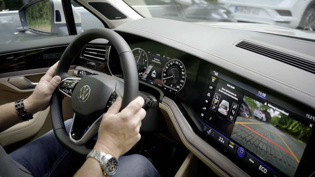 Caranya, pengguna perlu terus tekan butang ‘Drive’ pada telefon pintar. Jika mengangkat jari, Touareg boleh berhenti sepenuhnya. Aplikasi telefon pintar juga boleh digunakan untuk memandu keluar SUV tersebut dari ruang parkir sempit.