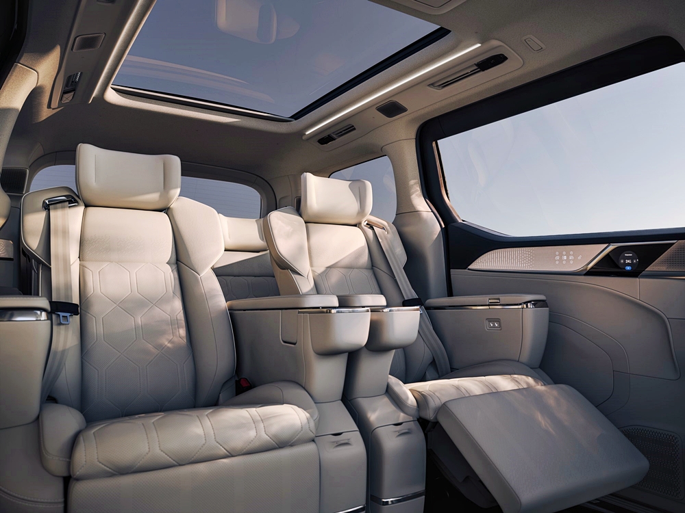 Skrin unit infotainment bersaiz 15.4 inci, dan penumpang turut disediakan skrin siling bersaiz 15.6 inci untuk hiburan bersama keluarga atau bermesyuarat yang disambungkan dengan kamera.