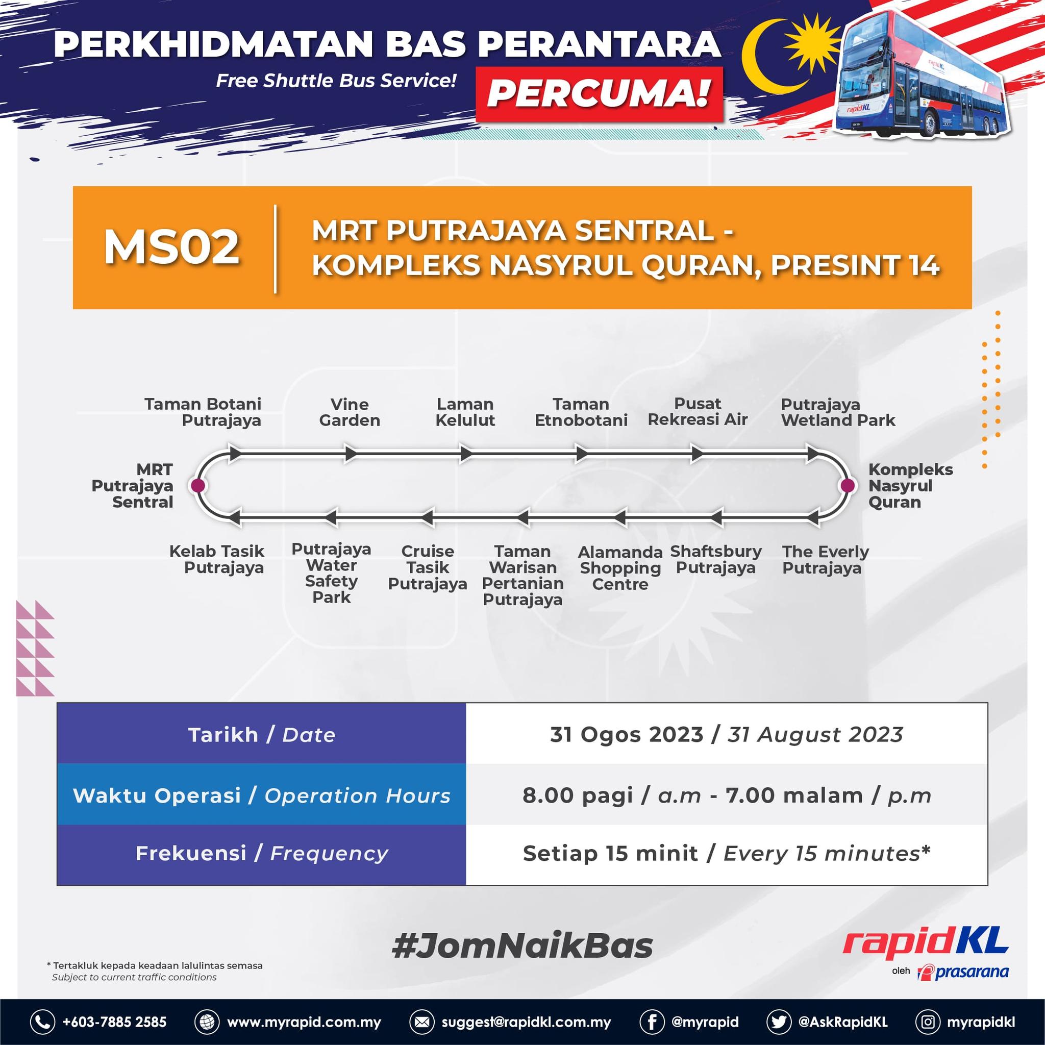 Juga ada perkhidmatan bas perantara dari Stesen MRT Putrajaya Sentral yang mana pengguna boleh bersiar-siar melawat tempat menarik dengan bayaran PERCUMA! Sila rujuk poster di bawah.