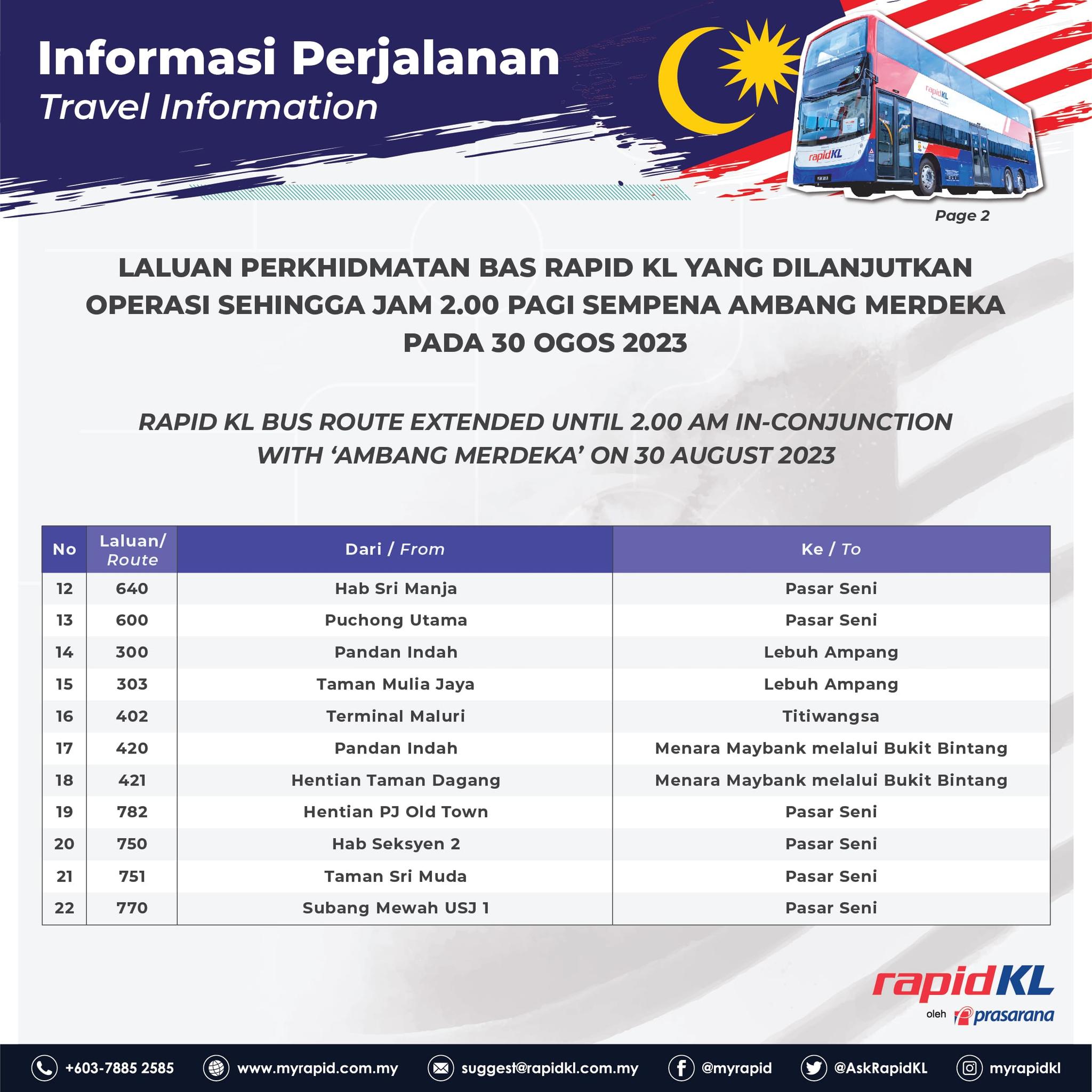 Sempena sambutan Ambang Merdeka 2023 pula, waktu operasi laluan perkhidmatan bas Rapdi KL terpilih (lihat jadual senarai bas di bawah) akan dilanjutkan hingga jam 2 pagi.