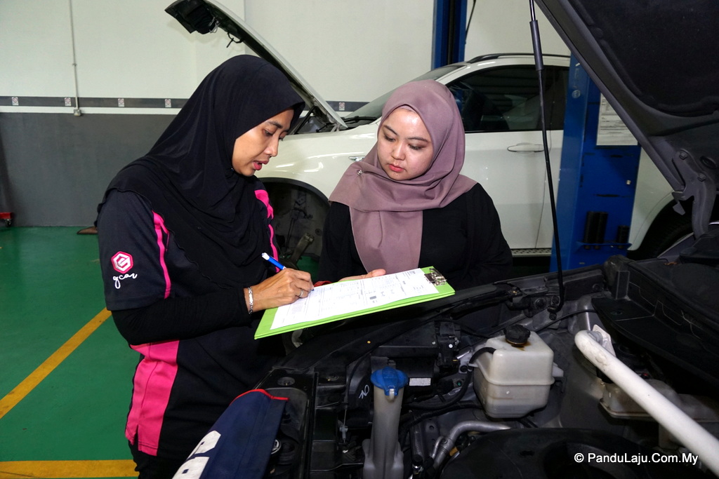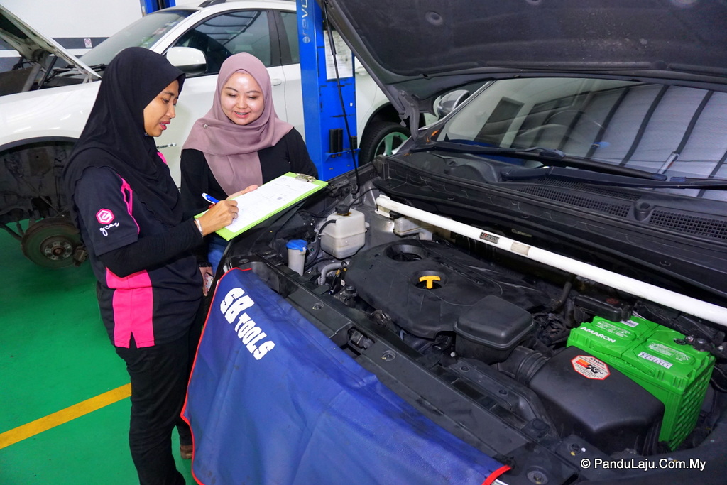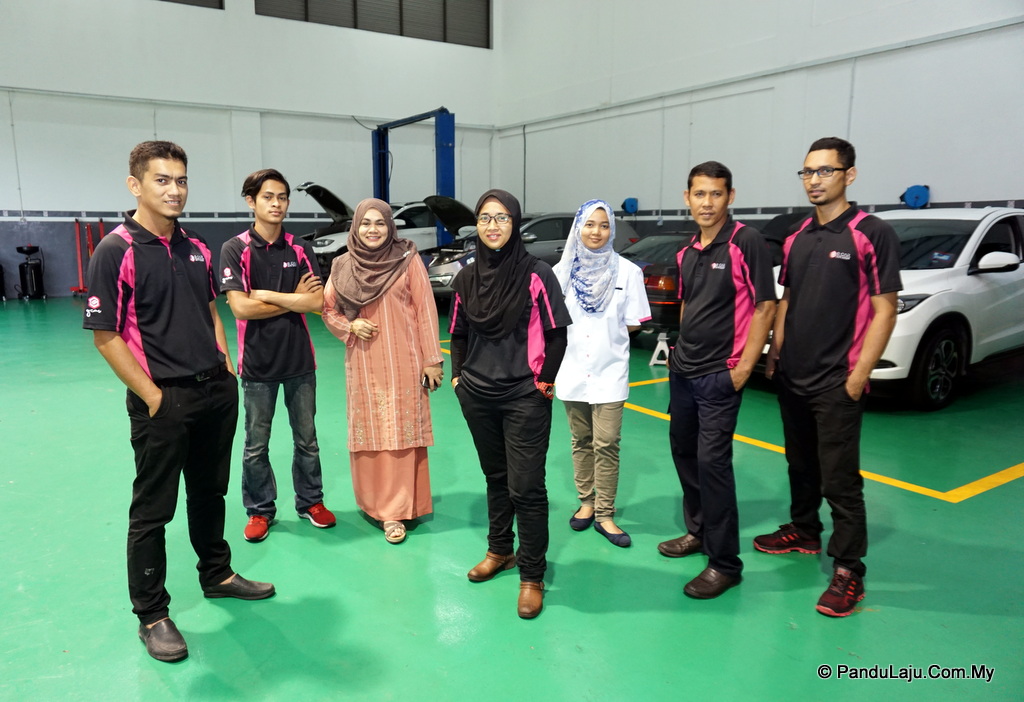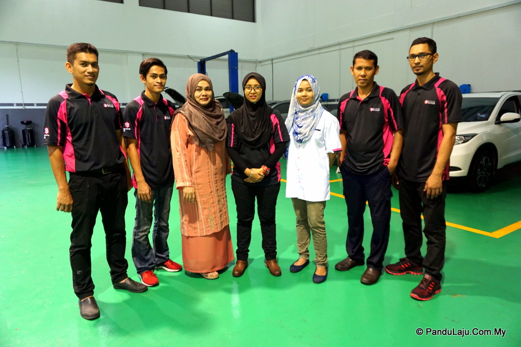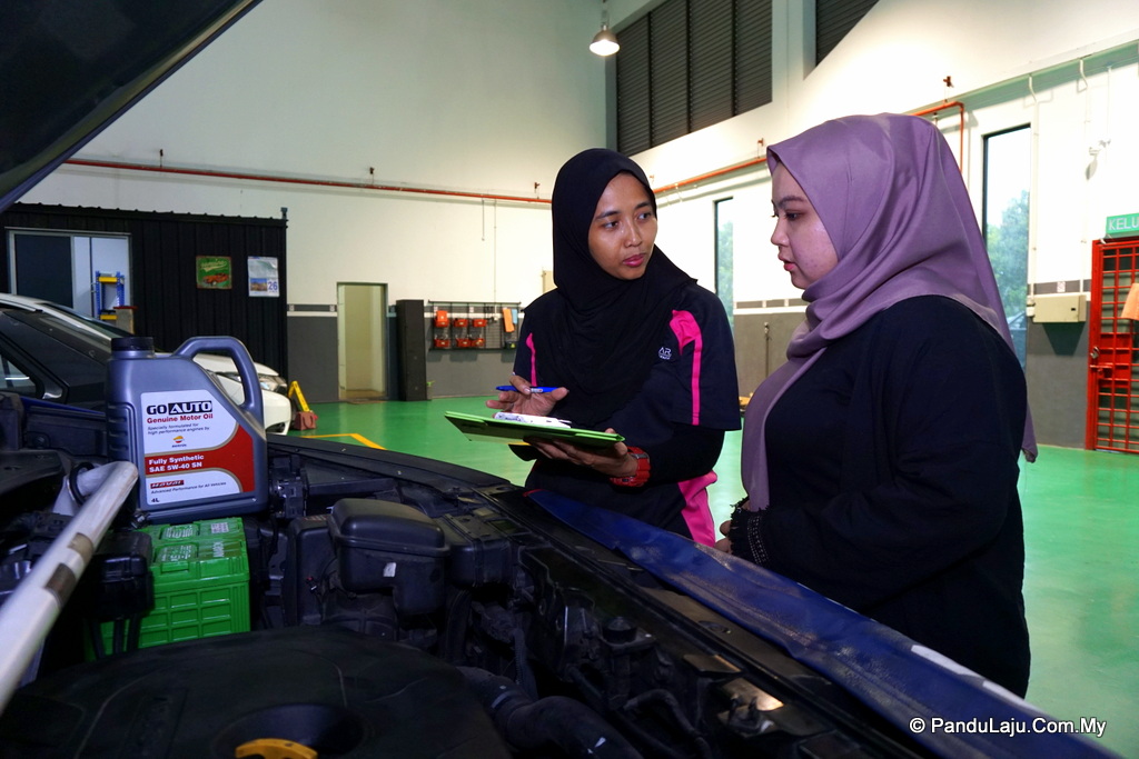 Maksudnya, apa saja hal kritikal mengenai penyenggaraan dan baik pulih kereta, semua itu mestilah dirujuk kepada Sazaimah Sai’on (baju hitam) yang bukan sekadar Ketua Mekanik di pusat servis tersebut, tetapi juga menyandang jawatan Pengurus Besar G-Car Manufacturer Sdn Bhd, juga anak syarikat di bawah Go Auto selaku pengedar rasmi kenderaan HAVAL di Malaysia.