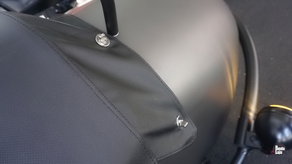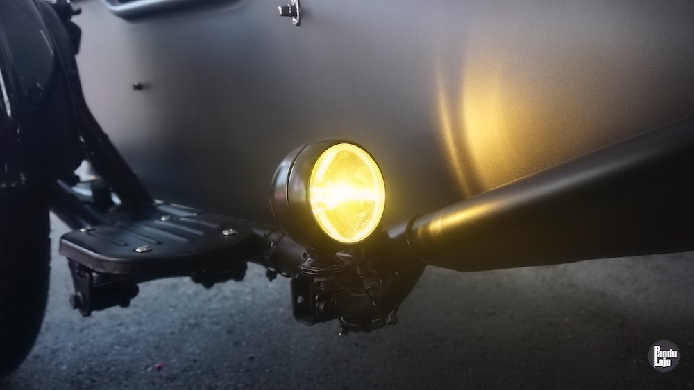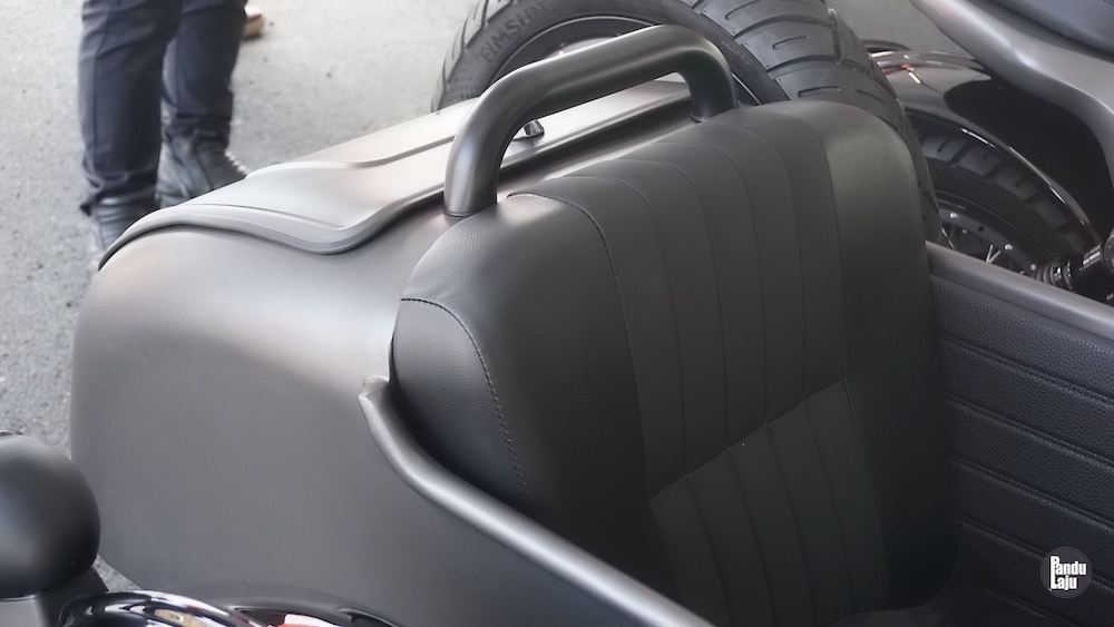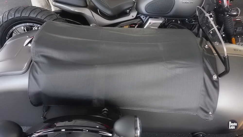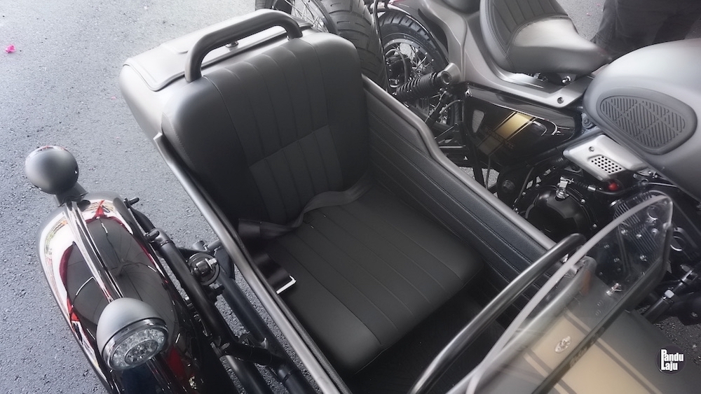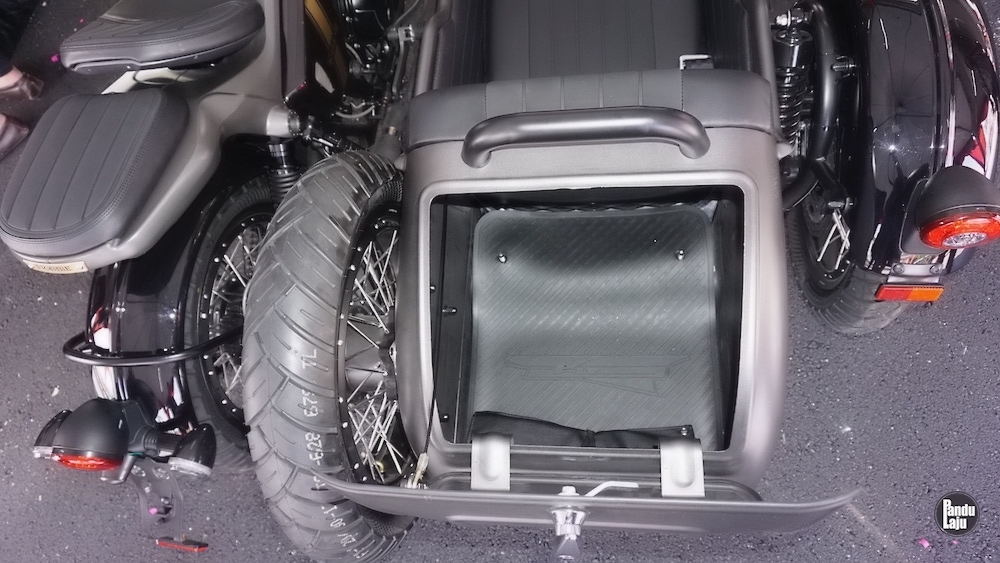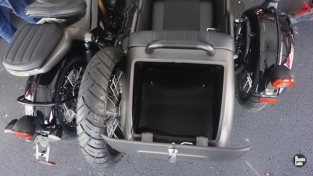 Sidecar juga dilengkapi visor angin dan tambahan lampu kuning. Di belakang, ada ruang simpanan untuk letak baran, dan disediakan juga kanvas khas untuk menutup pelana Sidecar jika tidak digunakan.
