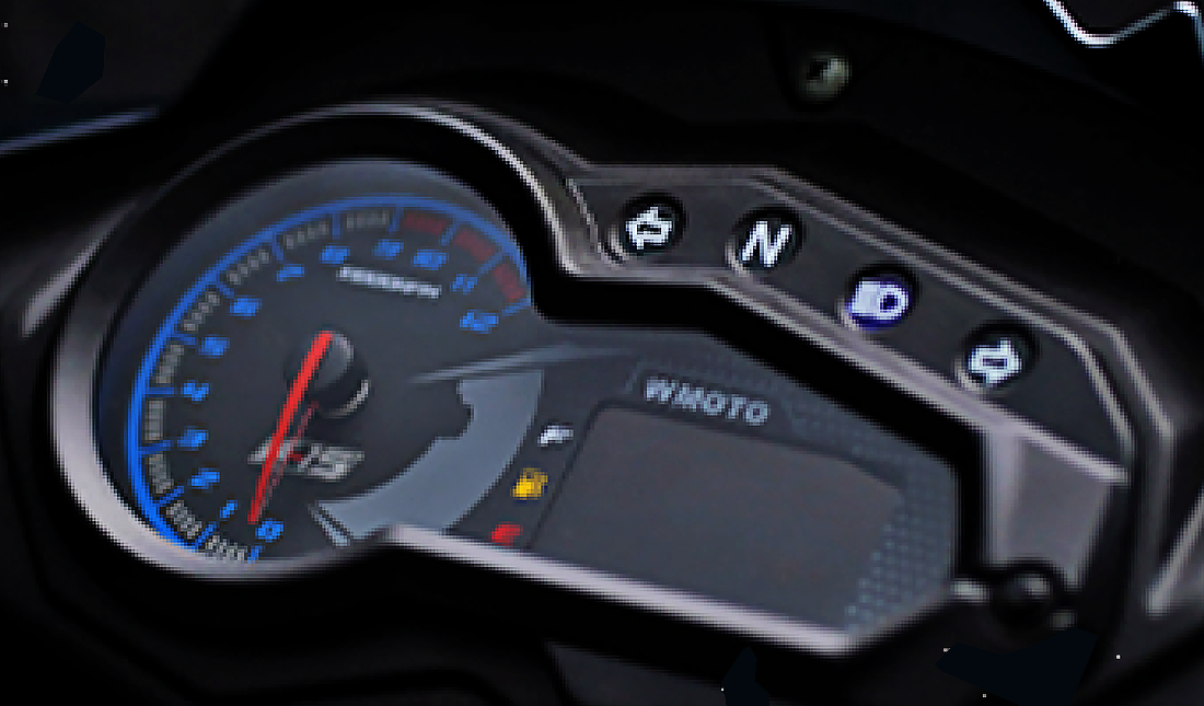 - Sebagai bonus, meter digital juga menunjukkan status baki kuasa bateri motosikal, dan ada beberapa lampu amaran diposisikan atas panel meter.