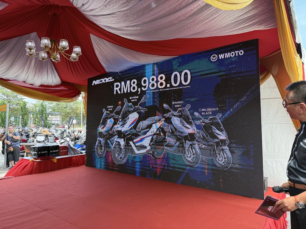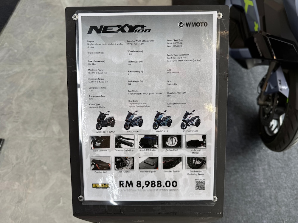 Ditawarkan pada harga RM8,988, tidak termasuk cukai jalan dan insurans), WMoto Nexy+180 boleh didapati di semua pengedar sah Mforce seluruh Malaysia dengan empat warna menarik: Magic Blue (biru), Midnight Black (hitam), Nardo Grey (kelabu) dan Xtreme White (putih).