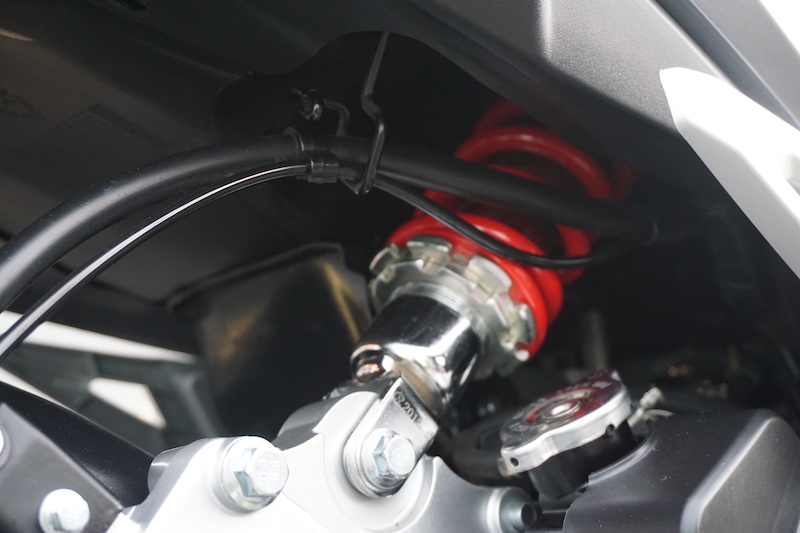 - Sistem suspensi menggunakan fork terbalik (USD) di depan dan monoshock di belakang yang dipasangkan condong seakan Ducati Panigale. Sudut monoshock ini membantu serapan hentakan lebih baik selain memastikan aspek keselesaan tunggangan tidak terjejas.