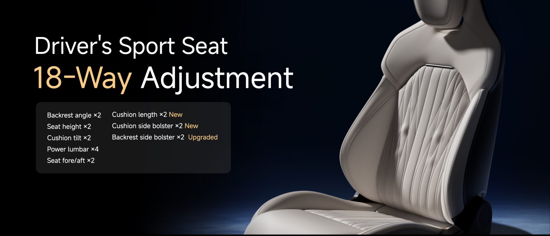 - Kerusi Depan: Fungsi pengudaraan dan pemanasan standard. Kerusi pemandu boleh laras elektrik 18-tetapan dengan sokongan sisi aktif dan penyokong kaki elektrik 60mm. Kerusi penumpang pula ada pilihan konfigurasi graviti sifar 123º
