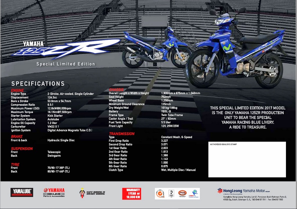 Bukan itu saja, setiap pembelian Yamaha 125ZR MotoGP edisi terhad turut menerima ‘sijil kelahiran’ beserta nombor casis, T-Shirt 125ZR, sarungan lengan dan poskad memorabilia.