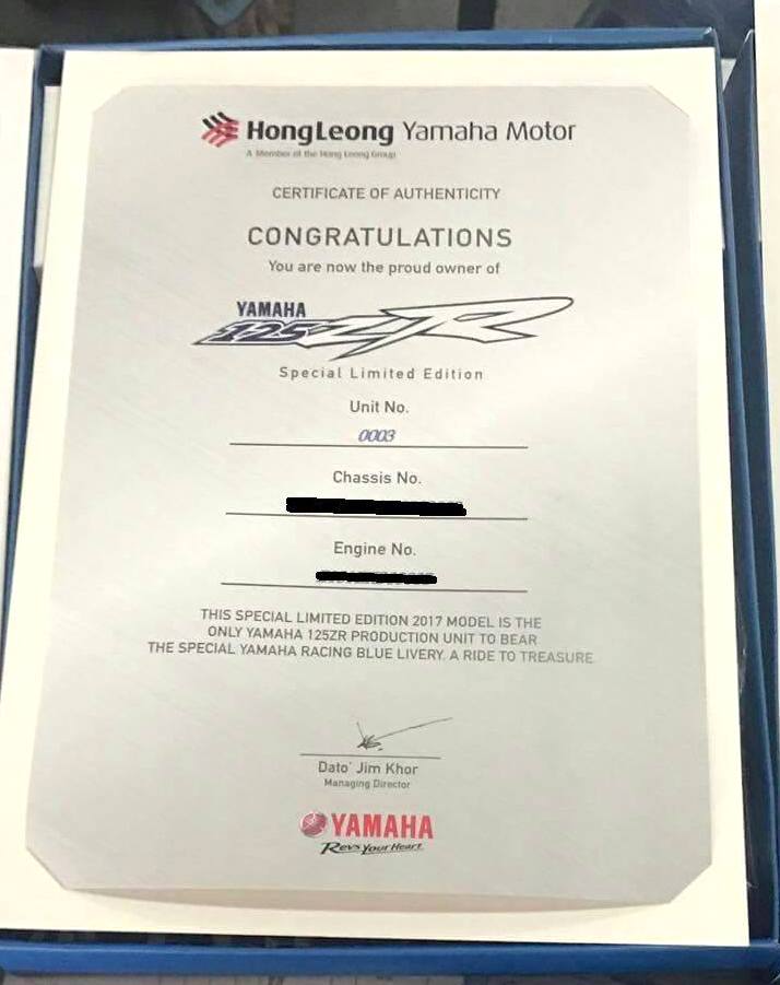 Ya, motosikal ‘kegilaan’ anak muda ini hanya dikeluarkan sebanyak 5,000 unit sahaja. Lebih menarik, setiap keluaran Yamaha 125ZR MotoGP edisi terhad ini mempunyai nombor siri tersendiri.