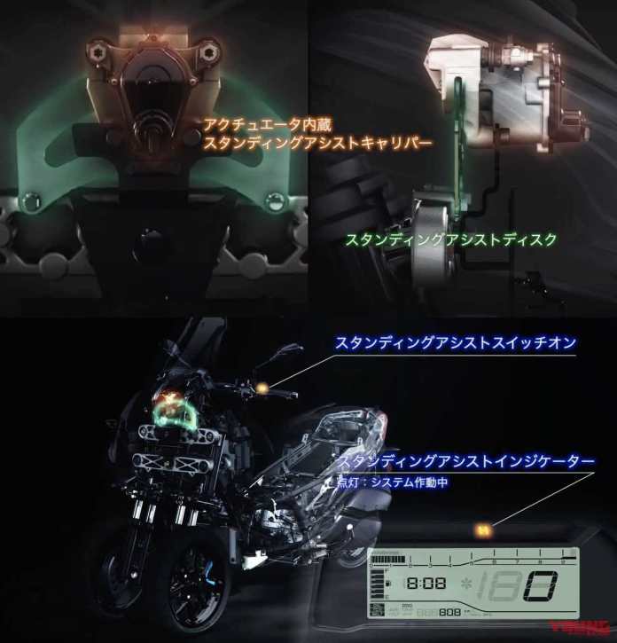 Berbeza dengan generasi Tricity 125/155 ataupun Niken yang tidak boleh berdiri secara sendiri maka untuk generasi terbaru Tricity 300 (2021) sebaliknya. Menerusi Standing Assist (Bantuan Berdiri) Tricity 300 memiliki frem dan elektronik baharu. Pemilik tidak lagi perlu menurunkan kaki apabila berhenti hasil daripada tuas khas yang mengunci suspensi secara elektronik.
