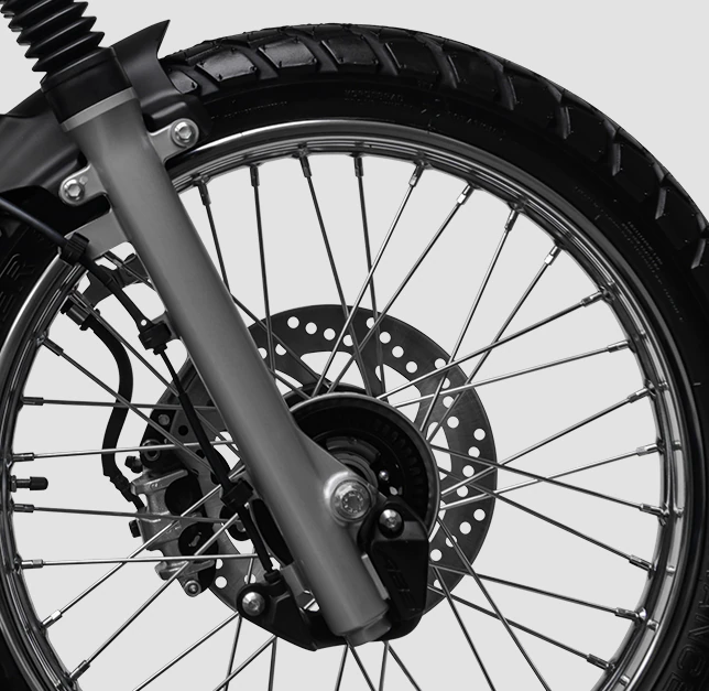 - Suspensi fork telekopik di depan dan monoshock di belakang.