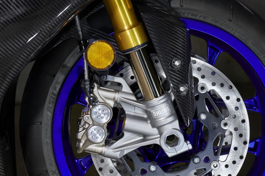 Bagi YZF-R1M, suspensi elektronik dinaik taraf dengan fork USD Öhlins ERS NPX, dan monoshock prabeban. Banyak komponen badan menggunakan material gentian karbon, manakala subfrem belakang daripada magnesium.