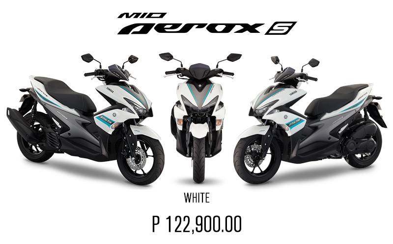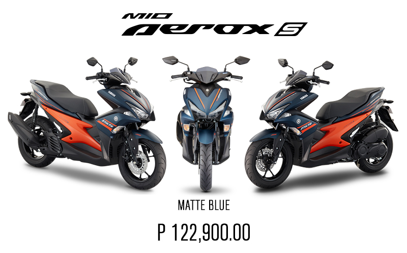 Mio Aerox S ditawarkan dalam warna Matte Blue (biru kusam)-strip jingga dan White (putih)-strip biru muda dengan harga pasaran Filipina, Php122,000 (RM9,319).