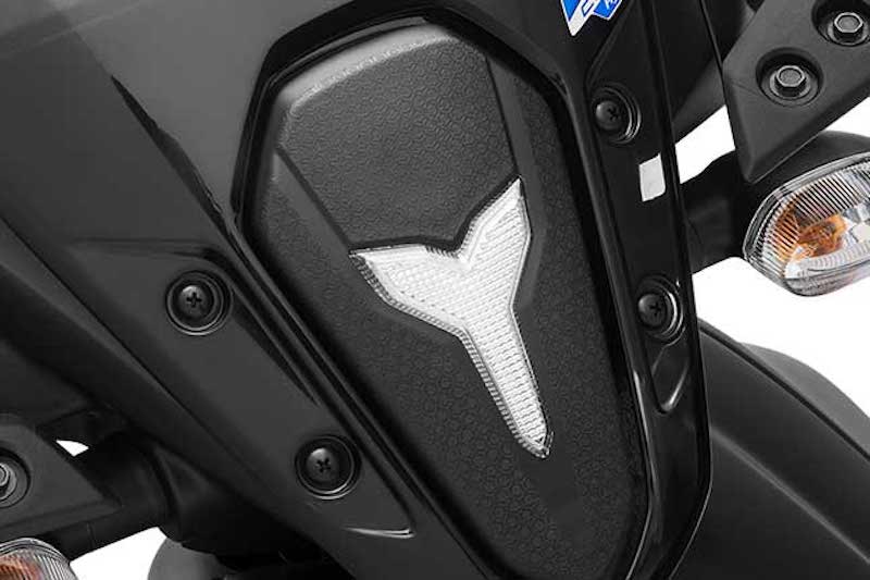 - Badan skuter asal berwarna hitam diberi liveri Monster Energy Yamaha MotoGP pada bahagian sisi dan panel depan. Tona biru turut dikenakan sebagai warna kontra.