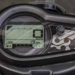 Panel intrumen memaparkan spidometer, takometer, dan odometer serta tolok minyak, termasuk lampu indikator untuk beberapa maklumat penting tentang kondisi semasa motosikal.