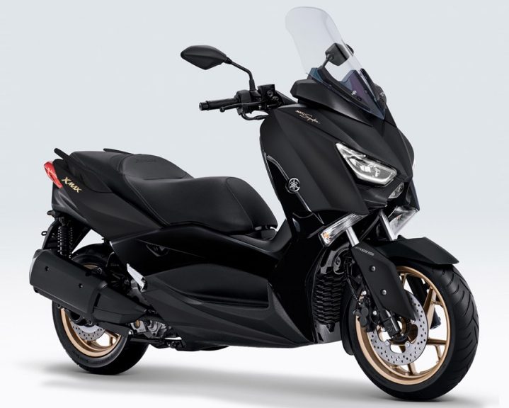 Model skuter tersebut tampil dengan kemasan Matte Black (hitam kusam) yang menjadi warna khas edisi tersebut, termasuk trim eksklusif seperti lencana ‘Maxi Signature’ dan rim emas.