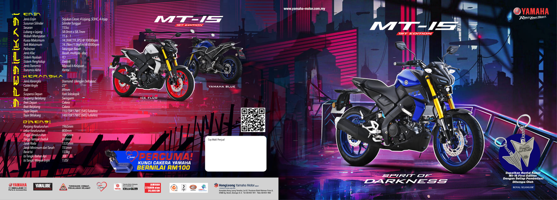 Ada dua pilihan warna ditawarkan, Yamaha Blue (biru) dan Ice Fluo (putih). Setiap pembelian akan diberikan kunci cakera brek bernilai RM100 dan rantai kunci MT-15 First Edition percuma.