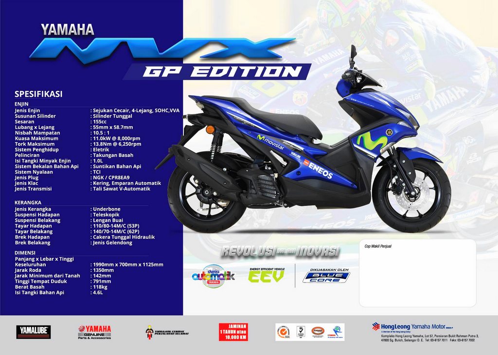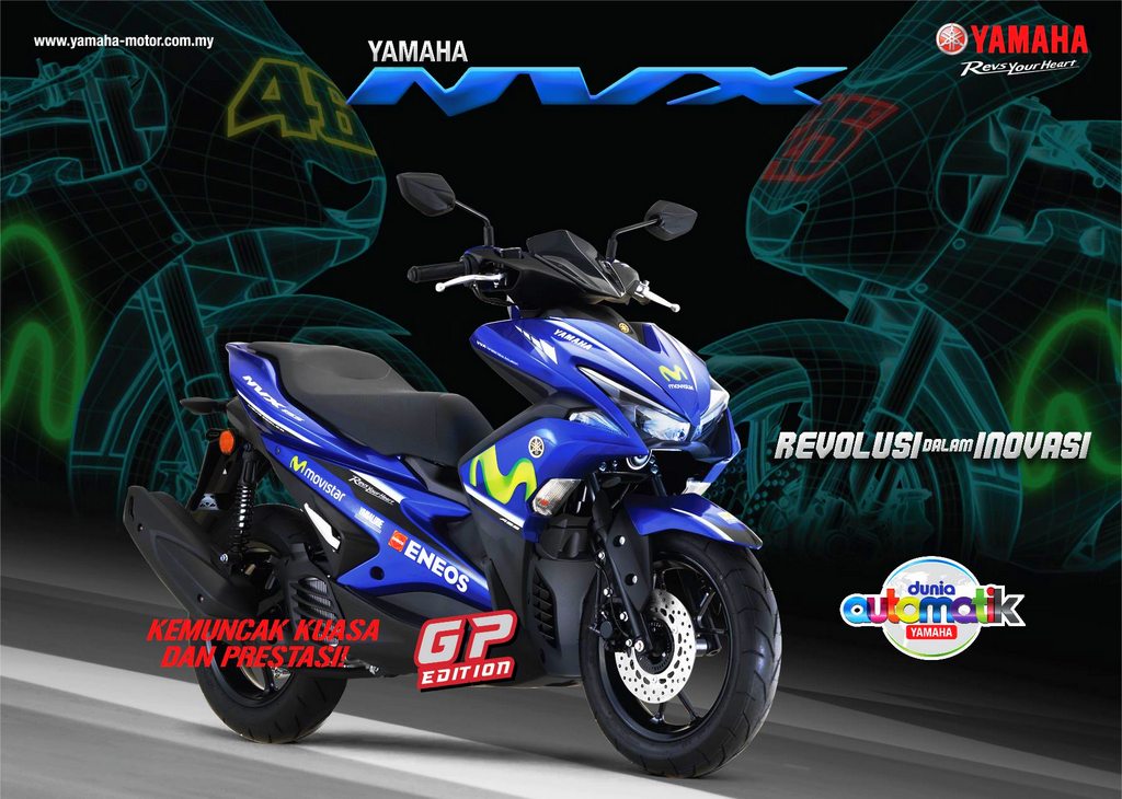 KHAS buat peminat skuter, terutamanya Yamaha NVX. Hong Leong Yamaha Motor (HLYM) memperkenalkan Yamaha NVX GP Edition sempena siri perlumbaan MotoGP. Skuter itu kali ini tampil dengan rekaan grafik khas berkonsepkan perlumbaan yang menyerlahkan imej lebih menarik. Selain corak grafik baharu, semua ciri dan mekanikal masih kekal sama.