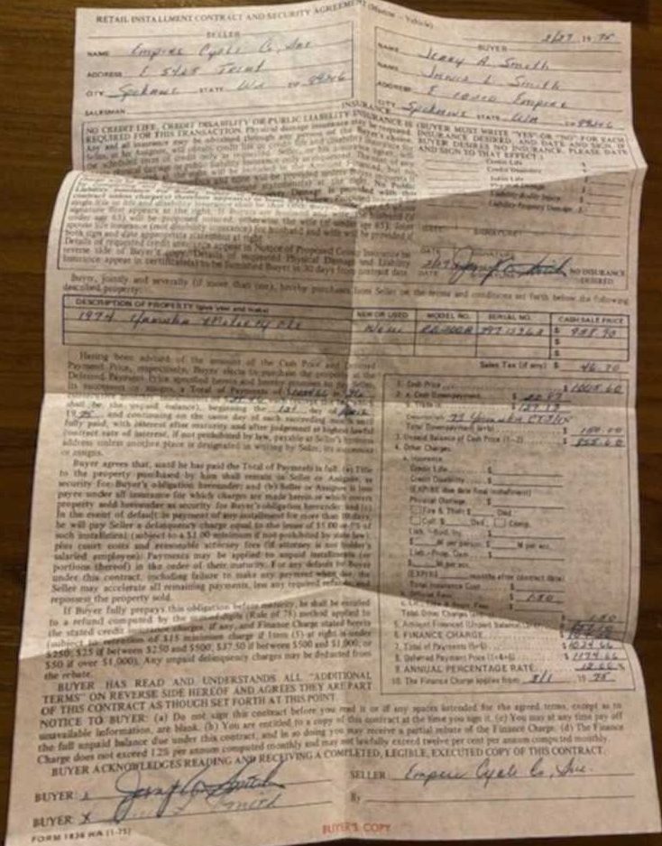 Resit asal pembelian menunjukkan motosikal ini dijual Empire Cycles di Spokane, Washington kepada pemilik pertama pada harga AS$1,005 (RM4,290). Selain resit, pembeli akan diberikan buku manual asal, kit peralatan, kad pendaftaran motosikal, surat perjanjian jual beli pemilik asal, dan semua dokumen mengenai motosikal berkenaan.