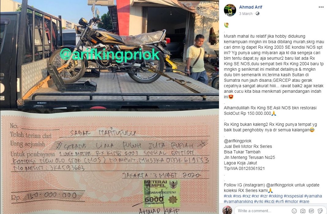 Penjual motosikal, Ahmad Arif menerusi akaun Instagram Arif King Priok berkongsi kisah RX King SE (2003) yang dijual kepada pembeli dari Sumatera, Sabar Napitupulu.