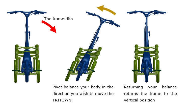 Jika mahu mengambil selekoh, pengguna hanya perlu pusingkan hendal dan condongkan Tritown seperti basikal dan kemudian kedua-dua roda depan, hendal dan pemijak kaki akan ikut condong mengikut arah belokan. Segalanya dilakukan dengan lancar dan stabil.