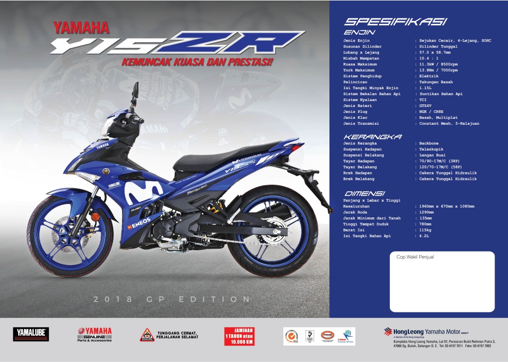 HONG Leong Yamaha Motor (HLYM) memperkenalkan Y15ZR Edisi GP versi ke-4 di pasaran Malaysia. Tiada apa yang menarik dan istimewa tentang edisi khas itu, cuma warna biru yang menjadi signatur jentera lumba Yamaha.