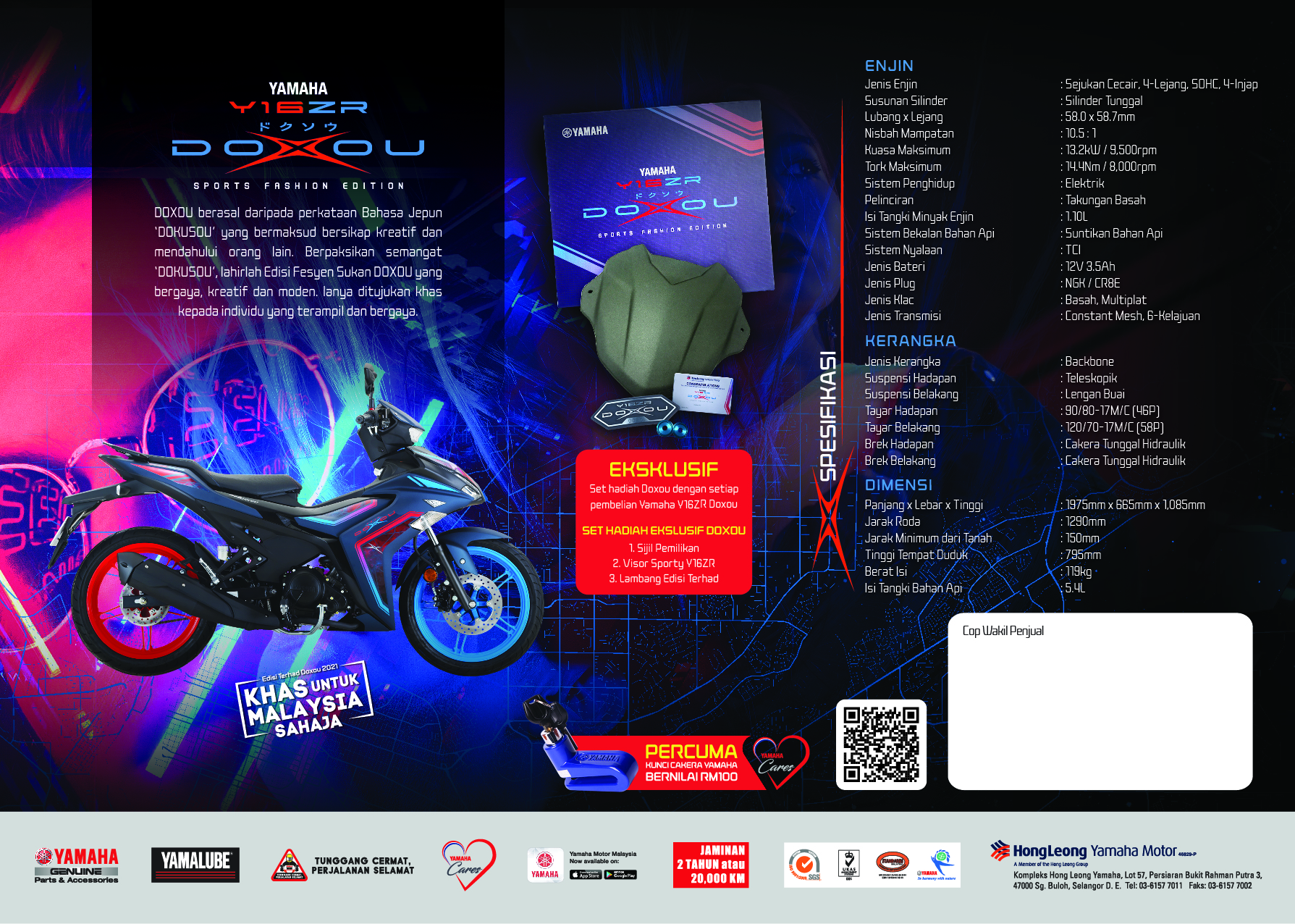 PENGEDAR rasmi Yamaha di Malaysia, Hong Leong Yamaha Motor (HLYM) memperkenalkan supermoped Y16ZR Edisi Doxou yang dikeluarkan dalam unit terhad, iaitu 5,000 unit sahaja, pada harga jualan RM11,688, tidak termasuk insuran dan yuran pendaftaran.