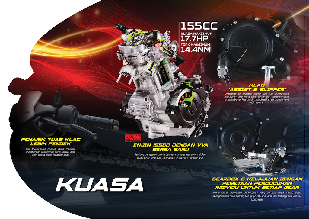- Menggunakan trenkuasa 4-lejang silinder tunggal 155cc SOHC VVA penyejukan cecair dengan teknologi suntikan bahan api berkuasa 17.7hp @ 9,500rpm dan tork 14.4 Nm @ 8,000rpm serta dipadankan transmisi manual 6-kelajuan.