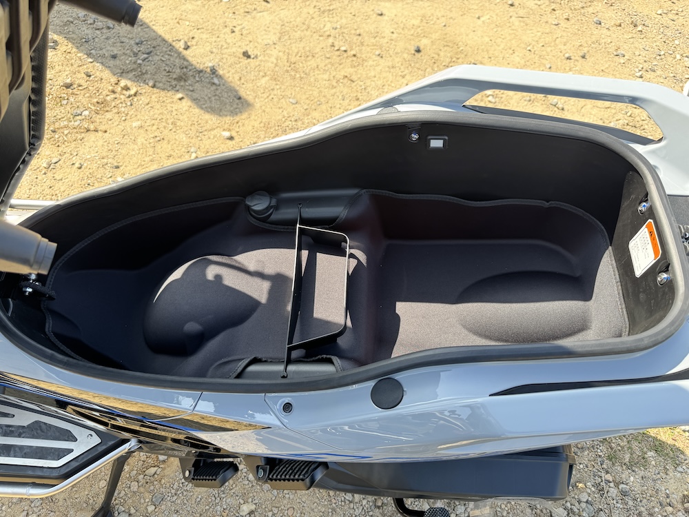 - Ruang simpanan bawah pelana 52 liter, boleh memuatkan dua helmet muka penuh.